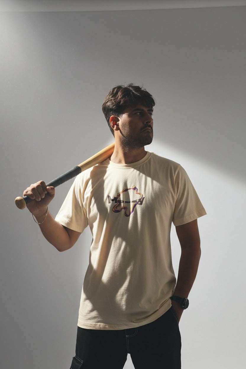 The centerpiece of metallic iridescent fluid streak with purple gold  — this ain’t just a tee, it's imperfect lava lamp